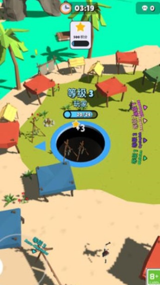 2、每局限时3分钟,随时间推进解锁更大体积阈值,前期只能吞掉一些比较小的物品。
